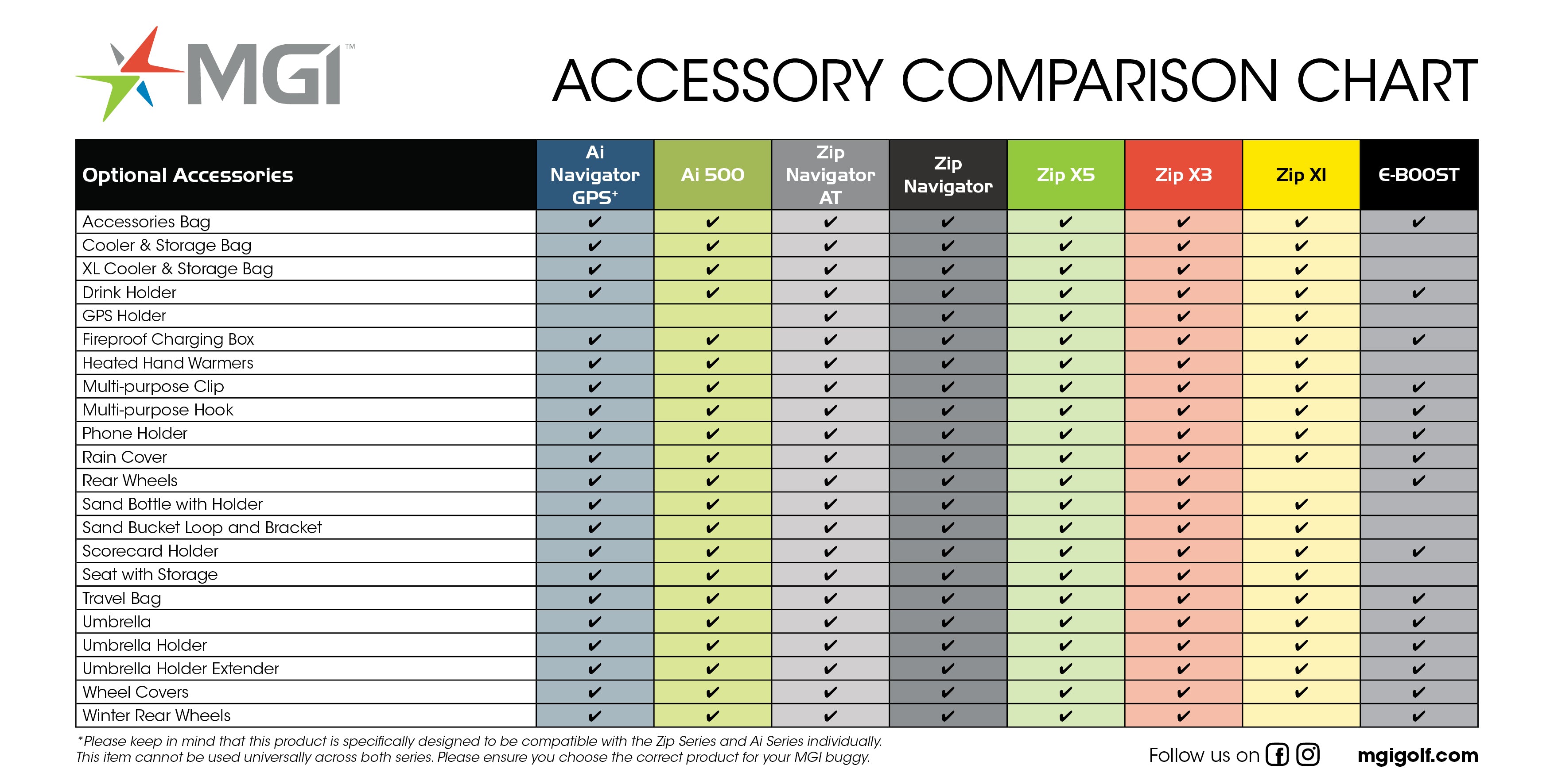 Check out this helpful comparison chart which compares the complete range of our MGI Accessories.